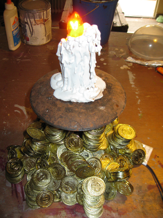 Next, I created the base by gluing gold coins into a pile, leaving an open space in the center so the light cord could pass through. Then the lantern base was glued on top, then the candle body on top of that. Finally, the lantern was reassembled.